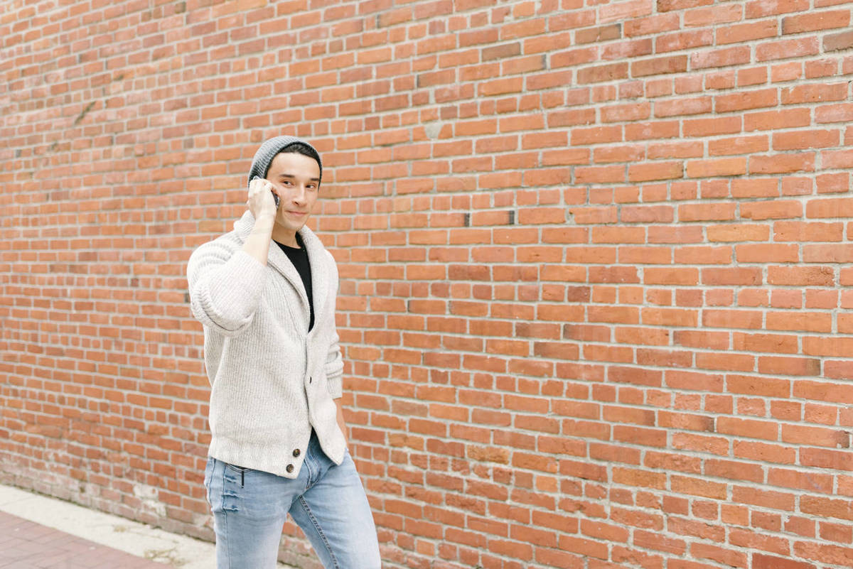 Young Man Talking On Phone While Walking Along Brick Wall Vancouver Canada Stock Photo Dissolve